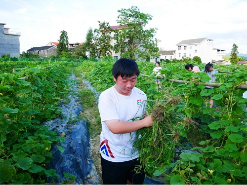 实践队成员在拿山镇钩边村干农活 给南瓜地养护除草