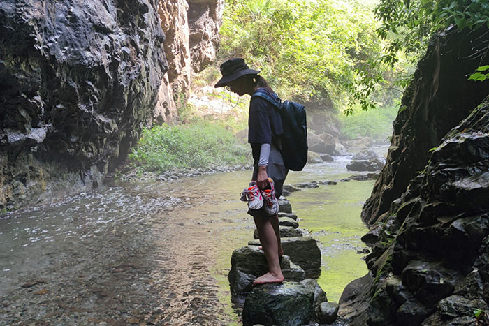 野调路上,队员踩着石块在溪流中穿行 江祖瑜