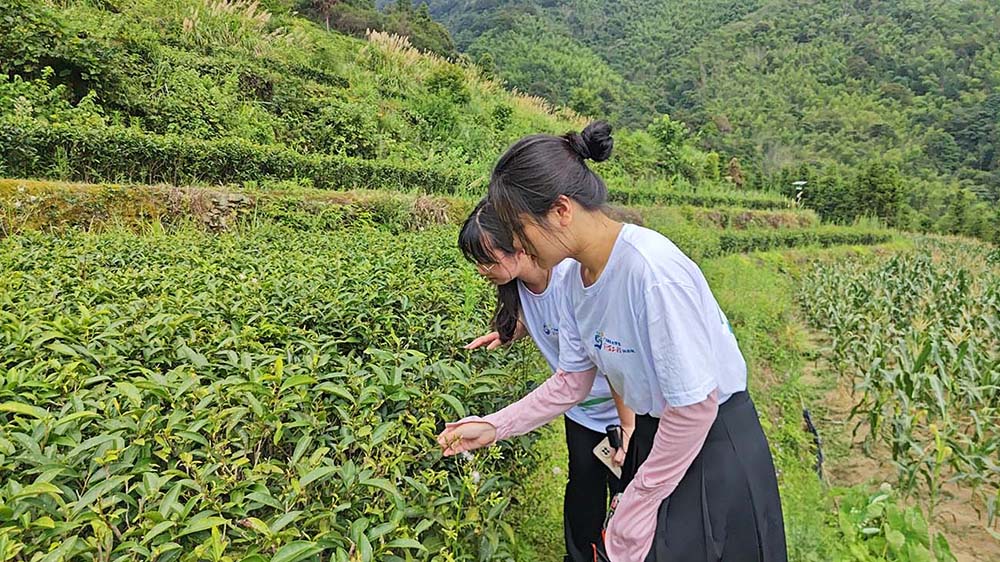 图为茶香富源实践队队员了解茶叶生长情况。通讯员 冯栩遥 供图。