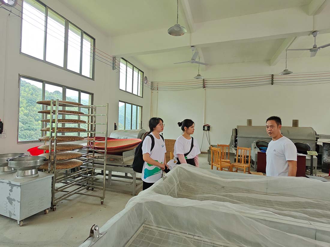 走访调研结束后,为探讨当地茶叶的主要品种、特点和产量情况,了解茶叶的加工过程,政府工作人员带领茶香富源实践队队员参观曹碓坑村茶叶生产加工基地。政府工作人员向茶香富源实践队队员详细介绍茶叶的加工工艺,并依次讲解了萎凋、发酵、杀青、揉捻、干燥等茶叶加工步骤、各个加工机器运作的方法以及注意事项、以及不同类型茶叶的加工特点。通过讲解,茶香富源实践队队员了解到茶叶加工对于茶叶品质的影响,以及不同工艺如何塑造出茶叶的特色风味。