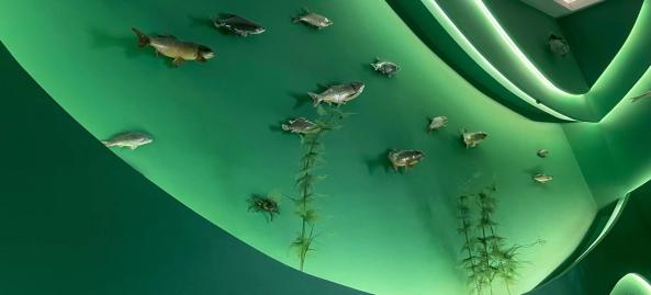 图为博物馆内“运河湿地寻趣”展厅中的鱼群