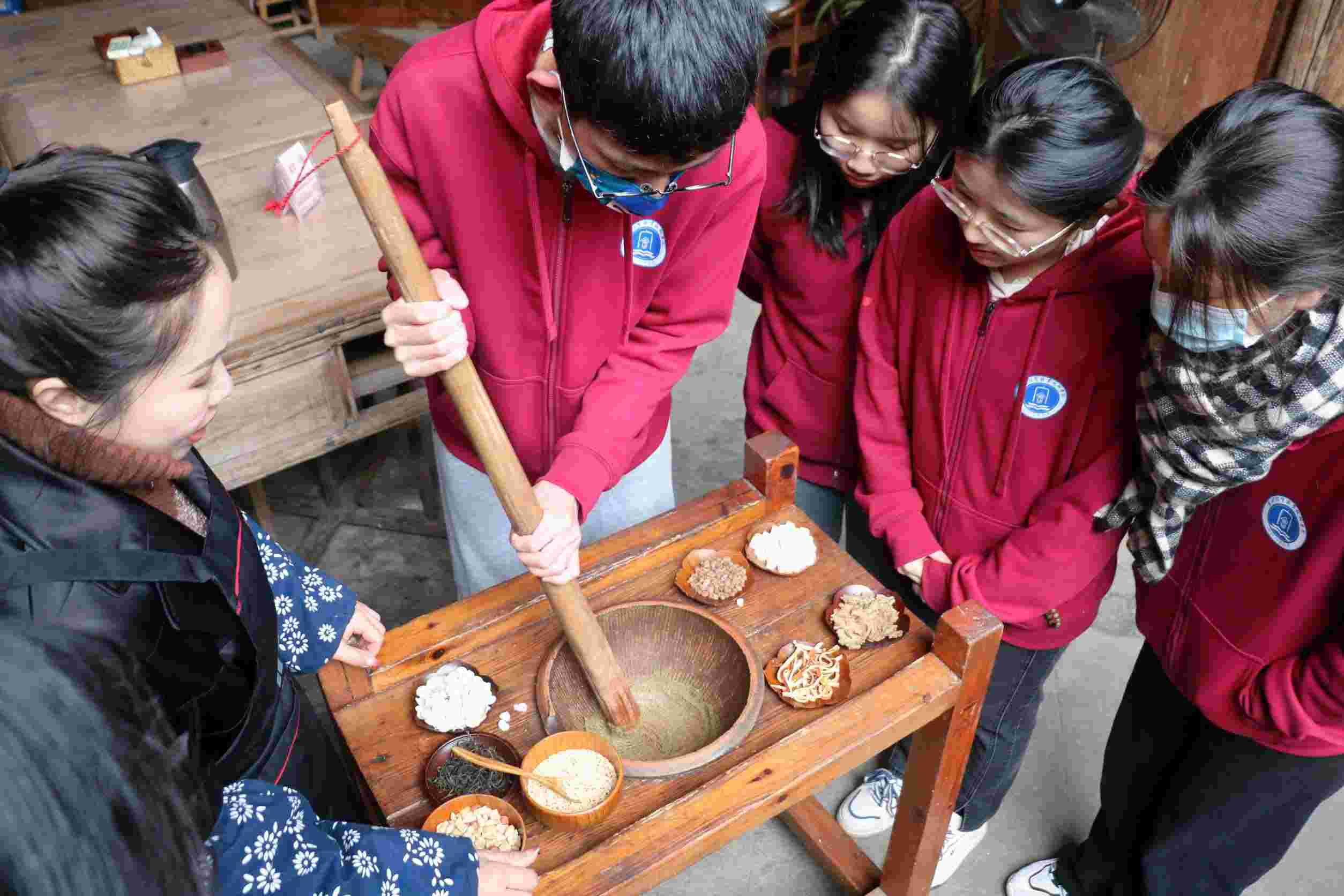 图为实践队队员在大龙擂茶传承人李华的指导下制作擂茶。
