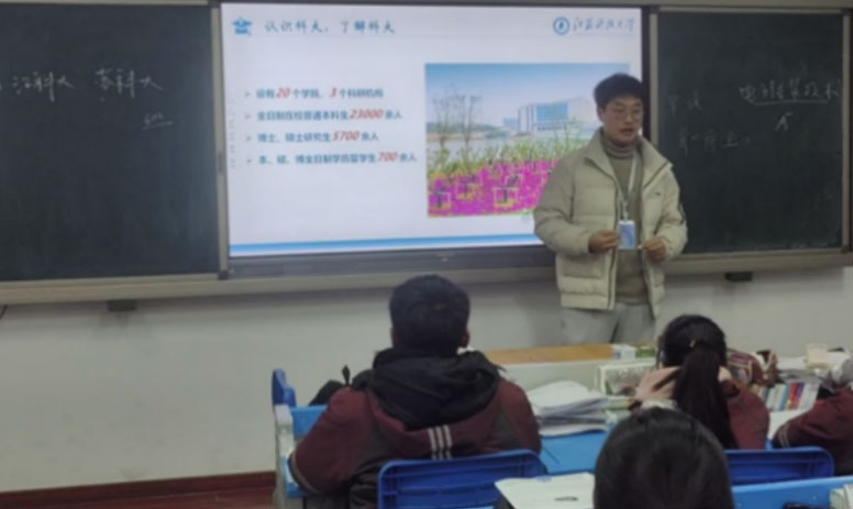 金典则发挥自己专业领域的优势,对江科大的中外合办特色进行了深入介绍。他详细介绍了自己所在的工商管理(中澳合办)专业,激发了同学们对国际教育的兴趣。同时,他还与同学们分享了自己在大学的学习和生活经历,鼓励他们积极追求自己的梦想。
