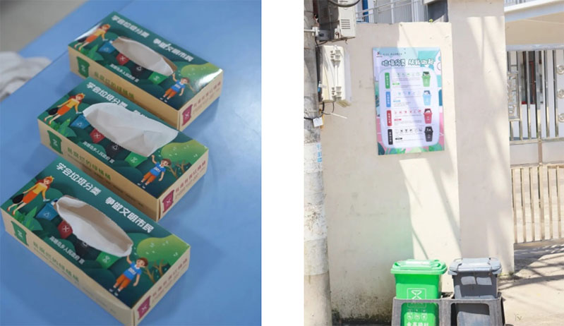 走过高塘岛的街道,随处可见垃圾分类的宣传,街道两侧排放着一排排的垃圾桶,纸巾盒上也印着垃圾分类的知识,每个路口也都贴着垃圾分类的海报。