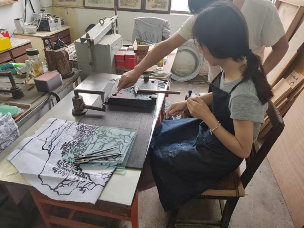 在参观博物馆的过程中,无意中听见了锤敲击铁发出的碰撞声,跟随声音团队成员误打误撞来到了铁画大师制作铁画的工作间,大家有幸观看了铁画大师现场制作铁画的过程。只见大师手持铁钳,在炽热的铁砧上熟练地翻飞着铁片,火花四溅中,一幅精美的铁画逐渐成形。大师一边制作一边为团队成员们讲解,调研团成员们纷纷感叹于大师们的精湛技艺和匠心独运。大师在制作结束后,邀请团队成员团队成员亲自体验铁画的制作,大家都积极体验,被铁画的魅力深深吸引。