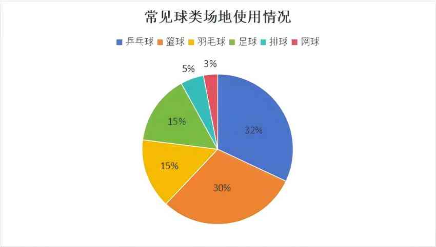 结合调查情况得出以下分析:当地常见球类场地使用情况中乒乓球占比32%,篮球占比30%,羽毛球占比15%,足球占比15%,排球占比5%,网球占比3%。由此可以得出乒乓球和篮球在当地受众人群较多,而排球和网球的受众人群较少。