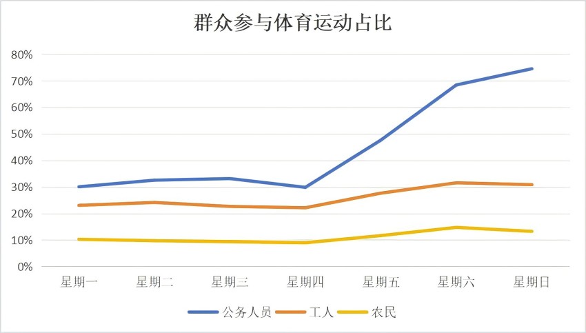 结合调查情况得出以下分析:公务员工作时间相对固定,工作之余可支配时间较多,且公务人员整体文化素质较高,对运动的健康价值认识较为充分,因此参与体育运动占比比例较大。而农民的劳动时间不固定,且整体运动意识相比较低加之农忙时节劳动强度大、时间长,影响其参与运动的积极性,所以农民整体的参与体育运动比例较小。