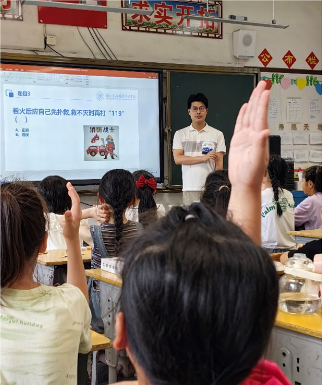 在消防安全主题课堂中,实践团队还通过观看消防安全视频、讲解消防知识、有奖竞答和主题绘画等方式,开展了消防知识普及和科普活动。在场的小朋友积极主动学习、踊跃参与互动、竞相回答问题,展现了良好的安全意识与学习态度。此次活动不仅带去了知识,更点燃了小朋友们心中对消防安全的热情与渴望。