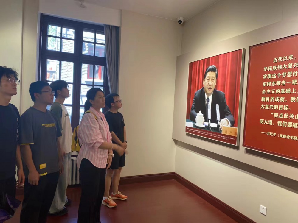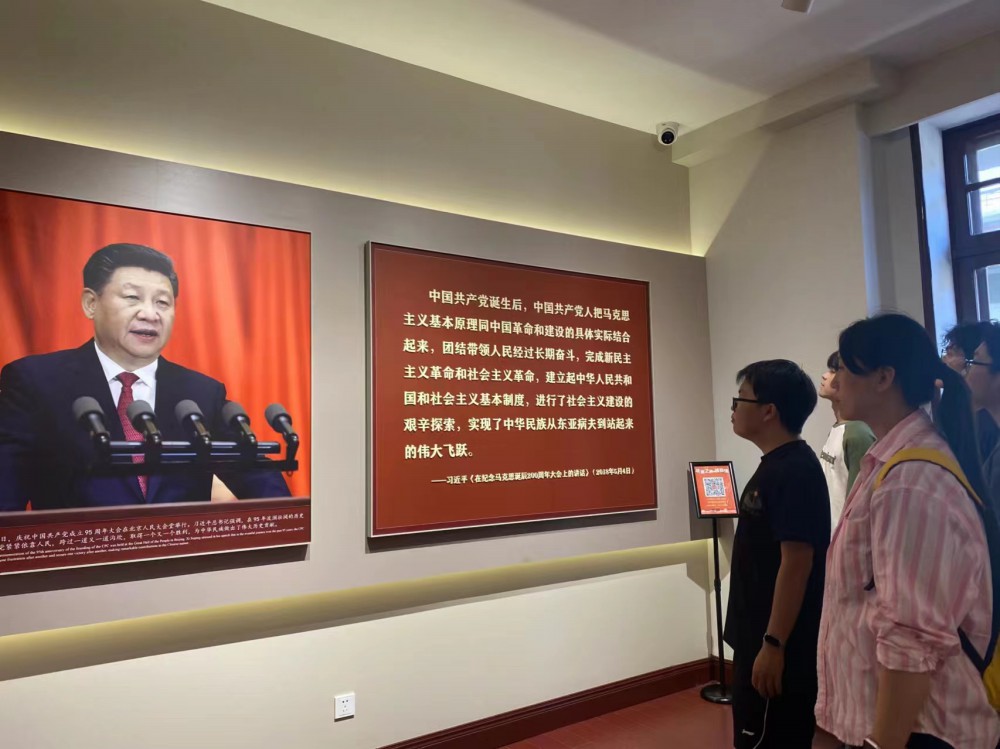 骄阳下,团队来到了北大红楼。北大红楼是打响新文化运动第一枪的重要场所,在这里,中国共产党扮演了至关重要的角色。近代思想的觉醒如同灯塔,照亮了共产党的革命道路,也告诫着前来参观的后人们,红色才是于中国而言最合理的路。因楼层封锁原因,团队成员参观了红楼的部分单元,从新文化运动开端启程,以播撒革命火种作结,如同亲历者一般见证了中国红色精神的发展,为民族觉醒贡献了一份至关重要的力量。团队成员走近总书记语录,丰富着对中国共产党的了解,纷纷记录,参观,饱含敬意。