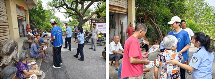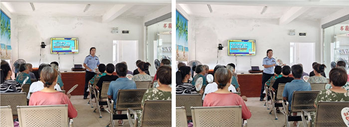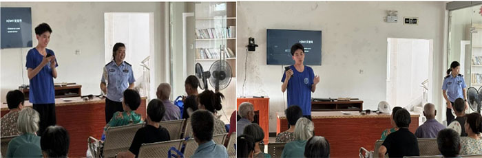 实践团成员朱子宸,朱庭均联合当地公安,以谨防诈骗为主题为当地的村民们带来了一场精心准备的反诈小课堂。课堂引入了当地现实发生的两起万元以上的诈骗案,通过讲述案件发生的始末,警示村民们需要时刻提防身边多种多样的诈骗。