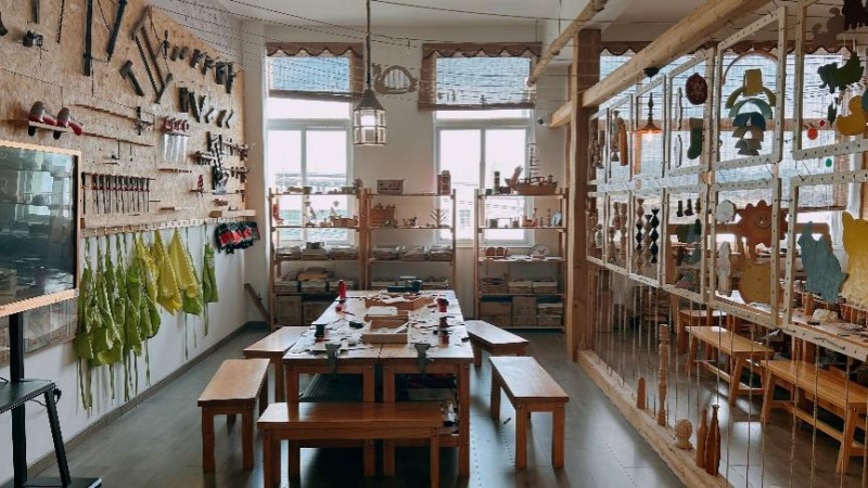 博物馆第四层是五大功能教室,设有木工坊、织造坊、印染坊、布艺坊和美食坊。其中木工坊摆放了各种工具,在制作过程中可以感受非遗木工技艺的魅力,体会中华传统工匠精神。美食坊特色区域的打造,旨在通过烹饪活动,激发孩子们的创造力、培养他们对事物的兴趣、加强与父母之间的情感纽带,同时让孩子养成热爱劳动、珍惜他人劳动成果的优良品德。