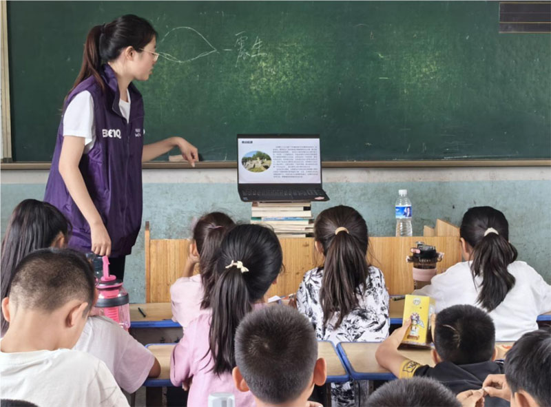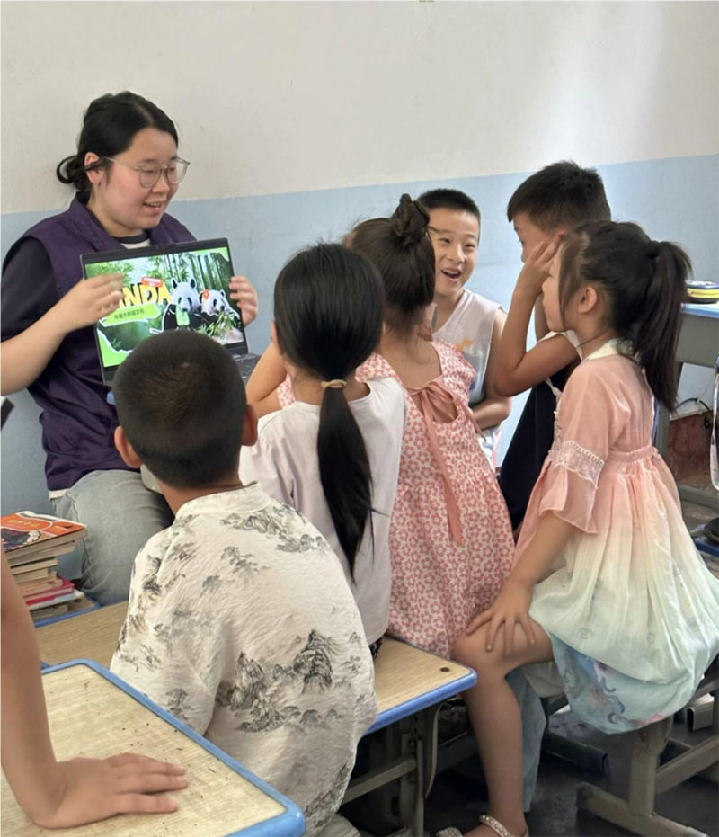 图为团队成员康诗雨为孩子们讲解大熊猫。图为通讯员王艺洁摄。