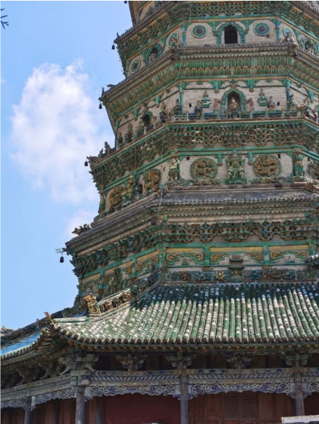 塔上的琉璃贴面精巧绚烂,反映了山西民间高超的琉璃烧造技艺,凝结了劳动人民的智慧结晶。阳光照射琉璃贴面而出现的七彩虹霓,宛若孩子们的笑脸,眼中有光亮,心中有梦想,积极乐观、充满希望。