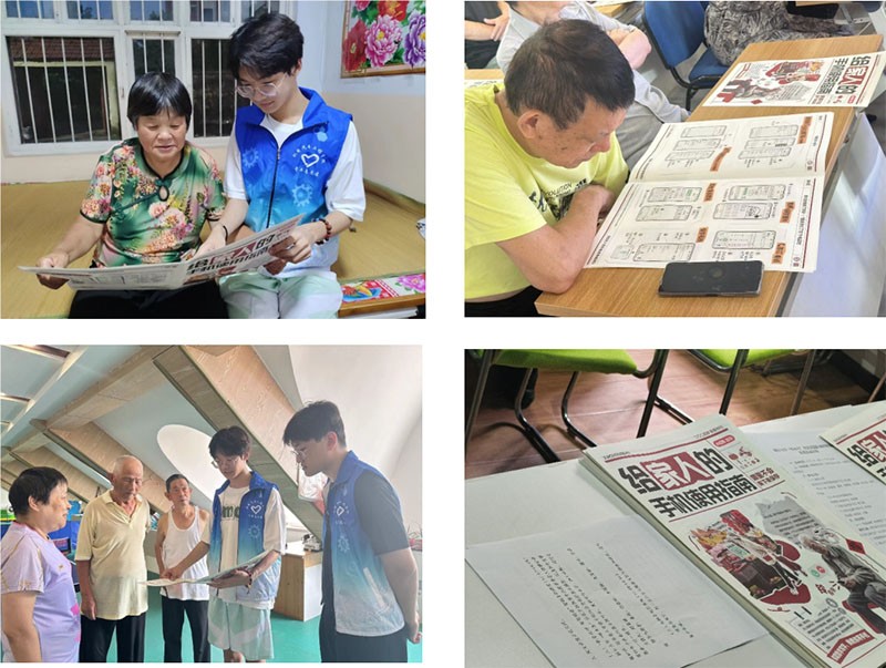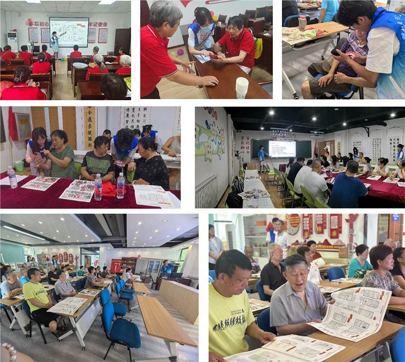 同时,团队先后到胶州市七建水寨幼儿园、胶州市七公司家属院等8个社区进行了活动宣传和走访,通过走访新时代文明实践中心、党群活动中心、社区文化长廊等地深入了解了社区的发展变迁、活动安排、活动需求。在调研过程中,团队主动走进居民家中,与居民的互动与交流,了解他们的真实想法与需求,为团队后续的实践活动提供了有力的支持。随后团队根据社区需求,为老人准备了特制的数字反哺知识报纸,并将这些报纸在公园内、社区里分发给老人,细致耐心的为老人宣传“数字反哺 智慧助老”智能手机课堂,鼓励老人积极的参与到之后的课堂中来。