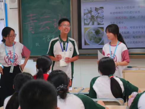 在课程的深入讲解中,高佳瑜从促进民族团结、推动地方发展、维护国家统一等三个方面,结合图片和视频详细阐述了冼夫人的杰出贡献。从“冯冼联姻,俚汉融合”到“劝兄从善,化解矛盾”,从“协夫理政,安民兴邦”到“举兵平叛,安定岭南”,高佳瑜带领学生穿过历史长河,钩沉历史况味,用一桩桩生动事迹逐渐描摹刻画出冼夫人鲜活立体的爱国女英雄形象。串珠成线,层层深入,高佳瑜引导学生进行小组思考与讨论,总结归纳出冼夫人爱国爱民、和谐进取的优秀品质,以加深学生对冼夫人文化内涵与精神内核的理解。课程的最后,高佳瑜指导学生进行诗歌朗诵。诗歌是情感的流露,是文化传承的载体。通过诗歌朗诵,使学生们能够更加深刻地感悟冼夫人精神,将其内化于心、外化于行。