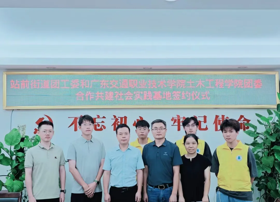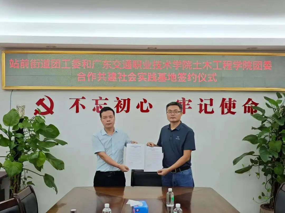 8月6日,广东交通职业技术学院土木工程学院团委与站前街道团工委顺利签订社会实践基地共建协议。站前街道办事处副主任李毅、站前街道团工委书记张维,土木工程学院党委书记张文风、广东交通职业技术学院“智创未来”实践队指导老师崔凤以及成员出席了签约仪式。