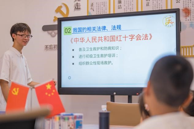 2024年8月2日,苏州大学青年教师领航团“哲学+”实践团携手“乐予乐行”实践团于苏州市美颂社区开展生命健康教育活动。本次活动旨在通过丰富多样的活动方式,与小朋友们一起学习和回顾中国红十字会的百年历程,学习与丰富基本急救知识,探索生命的价值与意义,引导他们理解和尊重生命,从而培养小朋友们的责任感与同情心。