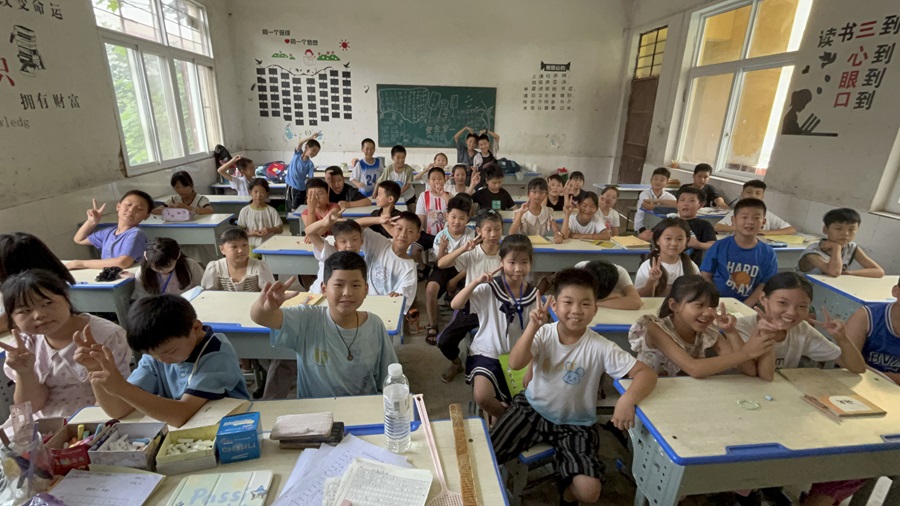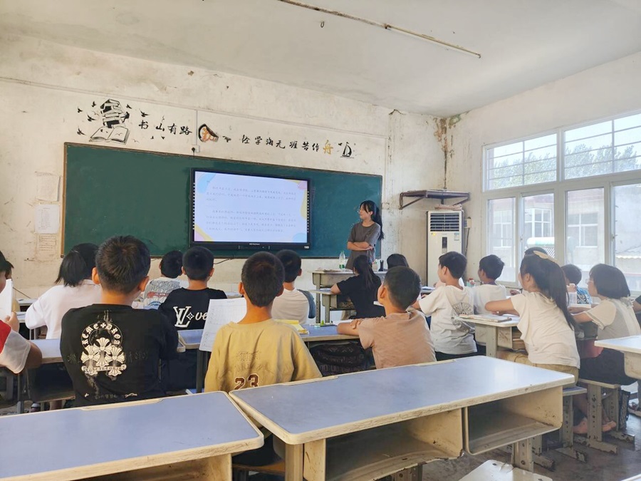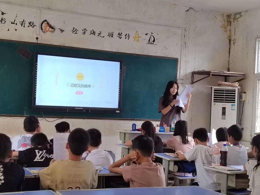陈瑞同学深知,语文不仅是文字的堆砌,更是文化的传承、情感的交流和思想的碰撞。在偏远的支教点,她面对着一张张渴望知识的脸庞,心中充满了无限的责任感和使命感。她明白,自己支教期间的每一堂课,都有可能成为孩子们打开世界之门的钥匙,成为他们人生路上的一个小小的转折点。因此,在语文课的讲台上,陈瑞倾注了全部的热情与智慧。她跳脱出死磕课本内容的思维,不仅仅满足于教授孩子们识字、阅读、写作等基本技能,更致力于引导他们深入文本,感受语言的魅力,理解文化的内涵。