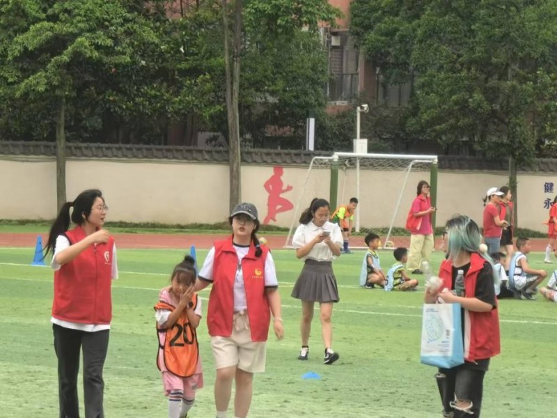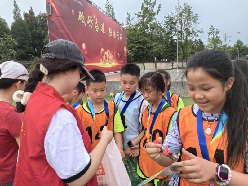 西南石油大学守望乡村社会实践团的志愿者们,在场外为孩子们准备了水和巧克力,陪伴鼓励着小队员们,为他们加油助威。