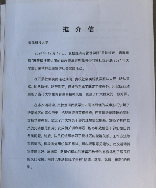 此次宣讲活动立足于传承红色文化基因,不仅为当地居民提供良好的宣讲教育接受了红色文化的熏陶,也为新时代青年提供了一个锻炼自我、服务社会的平台。宣讲工作得到了服务单位的一致好评,社区工作人员对经管学院的宣讲工作给予了高度评价。