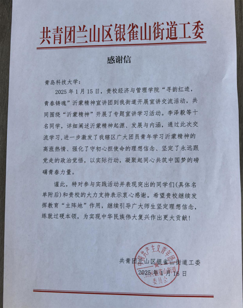为全面发扬习近平总书记关于“传承红色基因,讲好红色故事”的重要精神,赓续红色血脉,传承红色精神,激励广大青年在新时代中国特色社会主义建设中砥砺奋进,青岛科技大学“寻韵红迹,青春铸魂”宣讲团赴青岛市、临沂市开展一系列沂蒙精神宣讲活动,深入挖掘沂蒙精神丰富内涵,将其生动地呈现给青年学生及社会大众。