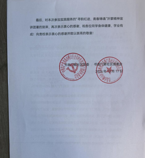 此次宣讲活动立足于传承红色文化基因,将沂蒙精神与青年担当紧密相连,激发了青年一代的奋斗热情和使命感。不仅丰富了社会居民的精神文化生活,也为新时代青年提供了一个展现自我、服务社会的舞台。下一步,“寻韵红迹,青春铸魂”志愿宣讲团将深耕沂蒙精神宣讲阵地,以红色经典铸魂,用生动事迹育人,争当沂蒙精神的深度传承者、笃行践行者和广泛传播者,让沂蒙精神在宣讲里历久弥新,于时代浪潮中熠熠生辉。