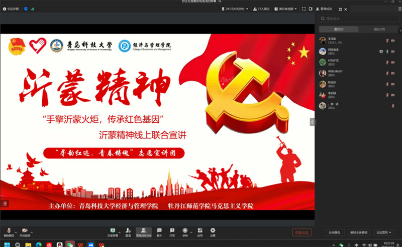 为使更多同学深入领略沂蒙革命历史,点燃爱国热情与奋进之志,志愿宣讲团倾力打造线上云课堂。成员们依托自身学习体悟及实地探访所获,全方位剖析沂蒙精神内核,呈现其在当下时代的传承脉络。他们呼吁同学们将沂蒙精神植入日常学习生活,立志成为新时代怀揣理想、勇担重任的青年先锋,积极投身沂蒙精神的传承与弘扬事业,续写红色精神的辉煌篇章。