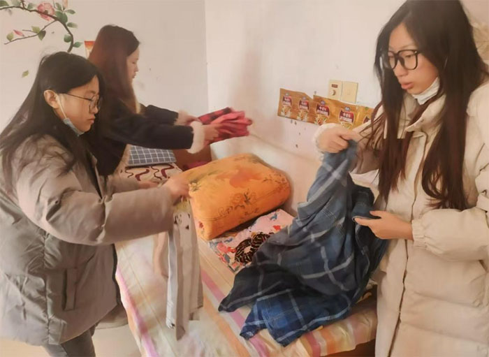 图为实践团成员尹思懿、卢琪姗、商莹在养老院为老人整理衣物照片
