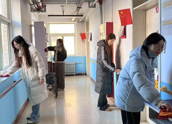 图为实践团成员李梦妍、尹思懿、董傲雪、商莹在养老院擦拭室内照片