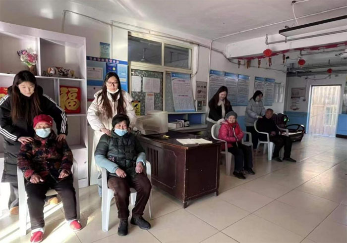 志愿者给老人按摩肩颈,老人们表示通过按摩,身体舒适度明显提高,疲劳也得到缓解,同时志愿者耐心聆听老人过去的生活琐事以及年轻的梦想。