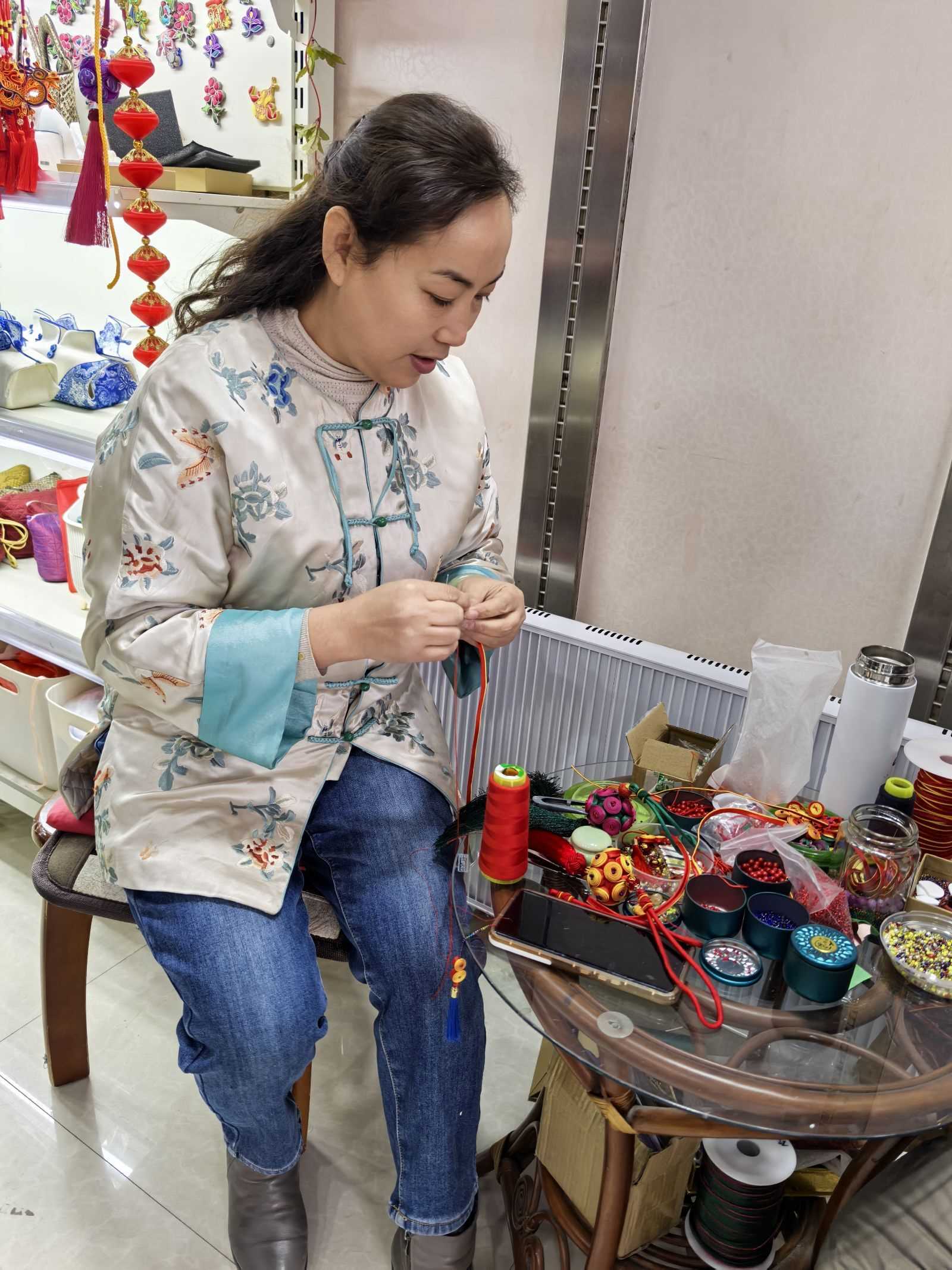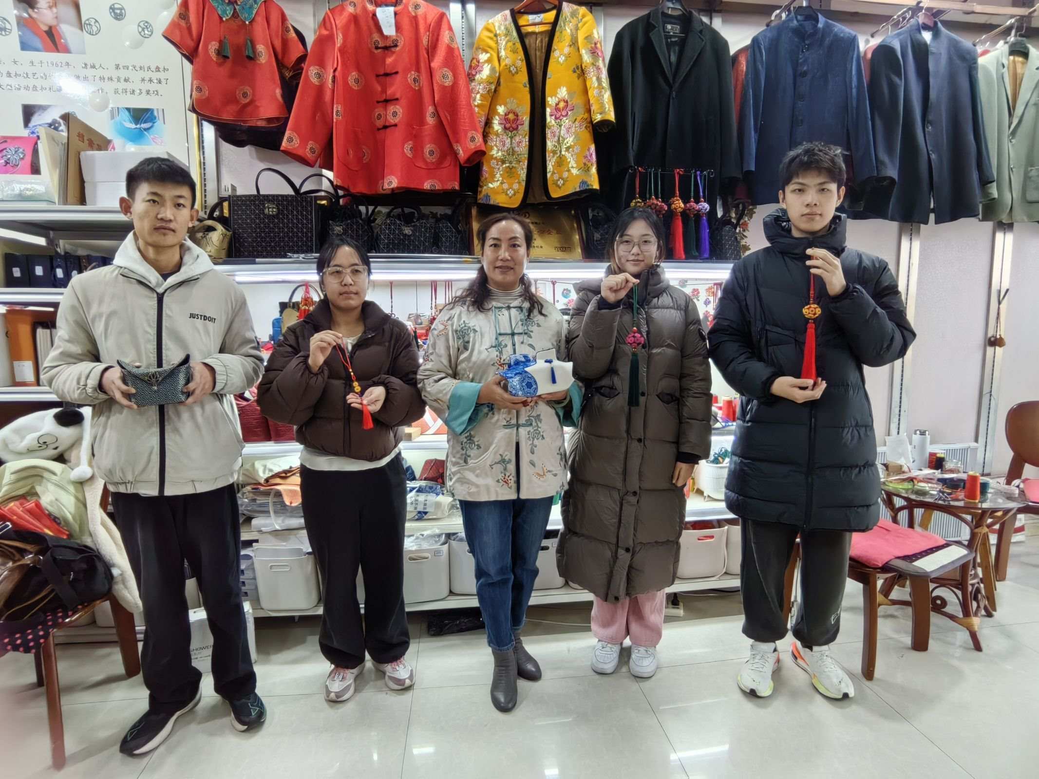 在刘氏盘扣非遗工坊,实践队成员们亲眼见证了盘扣的制作过程。从挑选优质的棉线、绸缎等原材料,到精心设计图案,再到通过盘、绕、编、缝等多道复杂工序制作成型,每一步都凝聚着匠人的心血与智慧。特别是当孙明秀师傅亲自示范如何制作一个小葫芦盘扣时,那条普普通通的盘条在她手中仿佛被赋予了生命,一圈一圈地缠绕,一针一线地缝制,最终变成了一个精美的小葫芦。这一幕深深地打动了在场的每一位成员。