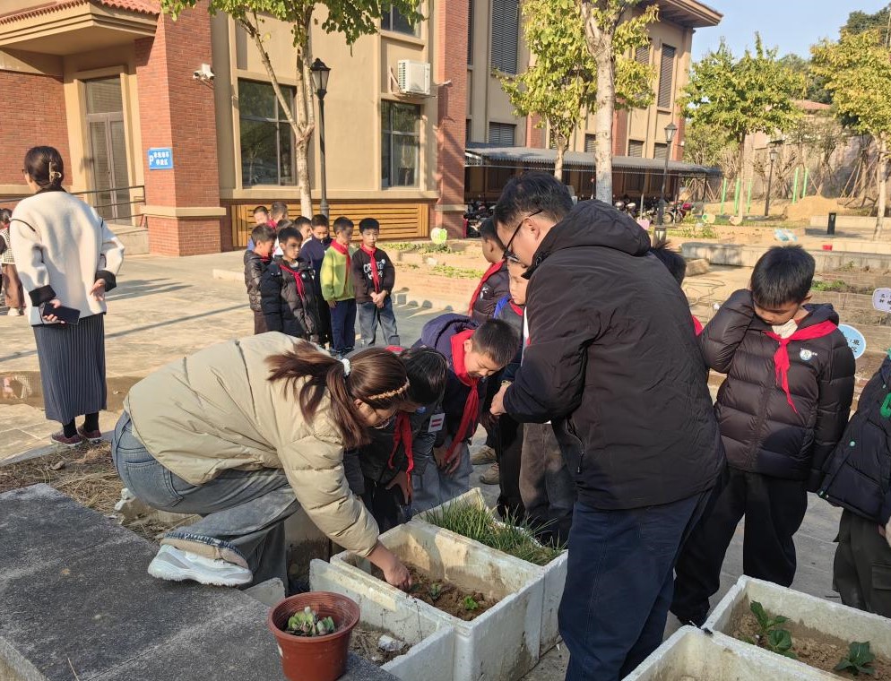 除了课堂上的知识传授,实践队还带领孩子们一同维护共建的“小水滴”菜园,队员们向孩子们介绍了田埂的规划和种植知识,指导他们进行浇水、除草和施肥等日常维护工作。孩子们在实践中亲身体验农耕文化的魅力,感受劳动的乐趣。一位参与活动的孩子兴奋地说:“我不仅学到了很多关于春节和农耕的知识,还亲手种下了一颗种子,期待它在春天发芽。”