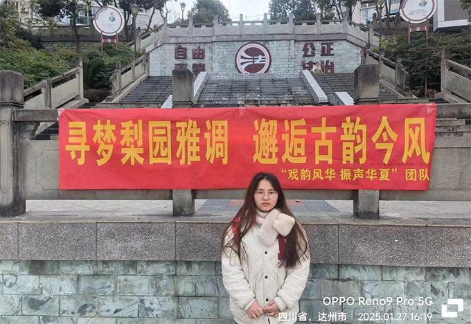 在四川省达州市的戏曲公园里,实践团成员陈禹彤开启了一段深入的学习之旅。她认真聆听专业人员的讲解,从戏曲的历史渊源到地方特色剧种的独特魅力,不放过任何一个细节。她仔细观察戏曲雕塑、壁画,学习戏曲道具的使用方法,深入探究戏曲文化的深厚底蕴,为后续的宣传活动奠定了坚实的基础。