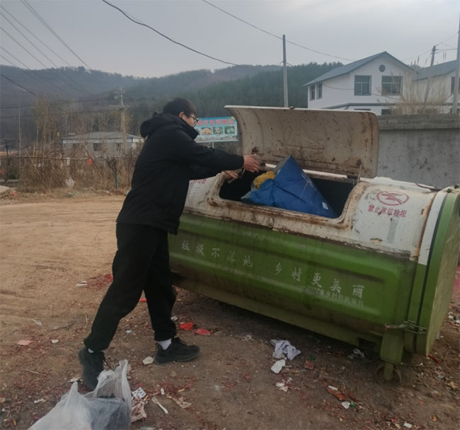 1月25日,李青杰帮助两位腿脚不便的老人收拾垃圾,老人的热情招待让他觉得志愿活动很有价值。