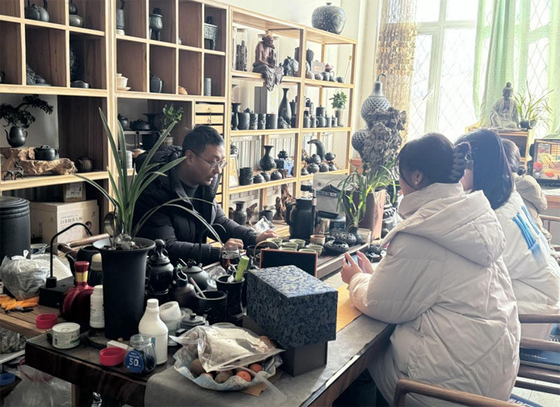 随后,同学们与当地的黑陶匠人王师傅进行了深入的交流。王师傅分享了自己多年来从事黑陶制作的经历和感悟,讲述了他在传承黑陶技艺过程中所面临的困难和挑战。尽管黑陶制作工艺复杂,传承难度大,但王师傅始终坚守初心,致力于将这门古老的技艺传承下去。