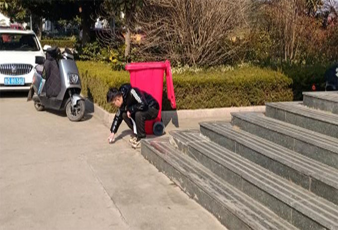 初返家乡李庆慧便开始工作,在梁邱镇中心小学学校门口与商店路口处,他将垃圾桶摆放整齐,并清理附近存在垃圾,在他眼中这都是守护保护环境的重要指引。他深知,只有充分守护好学校附近卫生,才能干好自己的职责。