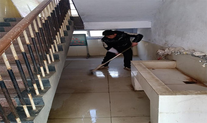 图为李庆慧清理公共楼道卫生区域