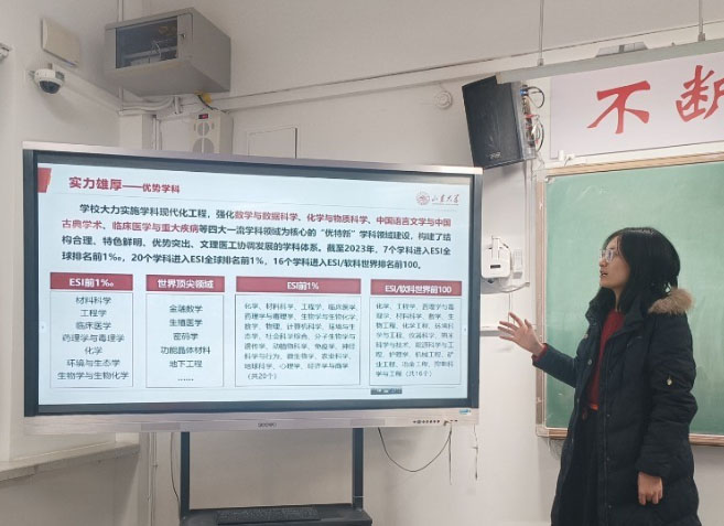 活动中,宣讲团队通过播放校园宣传片、讲解校史文化和学科优势等方式,使学生全面了解山东大学的办学实力与学术特色。通过系统介绍,当地学生对学校的优势学科布局和校园学术活动形成明确认知。