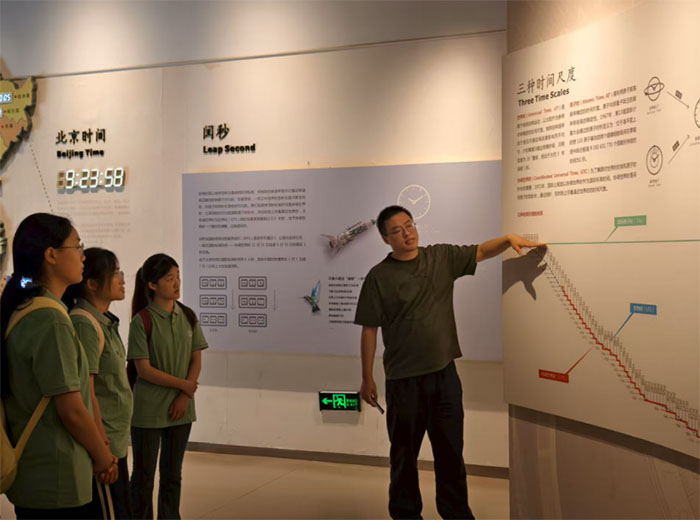 在“三种时间尺度”展区,讲解员系统介绍了世界时、原子时和协调世界时的构建过程及其在全球授时体系中的定位。队员们了解到,世界时来源于地球自转,具有自然性;原子时依托原子跃迁频率,保障了极高的精度;协调世界时通过两者平衡,实现了全球统一的时间标准。这一科学体系,既依托国际合作,也体现了自主创新,是现代社会时空体系的核心基石。