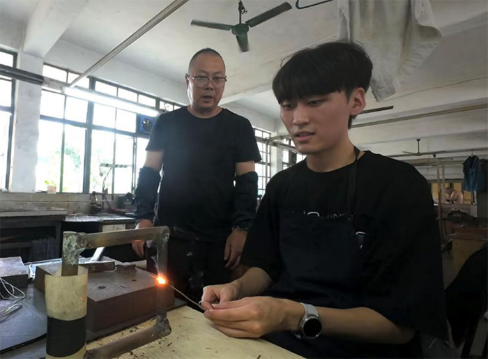 7月7日,在胡志成工作室,队员们迎来了最期待的实践环节——打铁画。分组后,有人选择锻打梅花,有人尝试錾刻蝴蝶,还有的挑战"福"字创作。