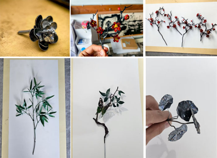 “叮、叮、叮...”工作室里锤声不断。队员小陈正全神贯注地敲打一片花瓣,额头渗出细密的汗珠。“力度要均匀,角度要准确,”胡老师在一旁指导,“铁画最考验耐心。”三小时后,当第一束“铁梅花”终于成型时,队员们忍不住欢呼起来。