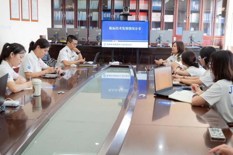 图为海口航标处工作人员给队员们分享航标技术发展情况