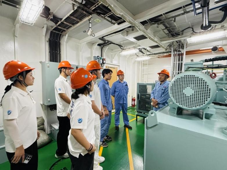 在国投厦港海南拖轮有限公司,“国投厦港拖18”轮成为实践队探索船舶智能化的核心场景。指导轮机长、轮机99级校友颜旺平带领队员深入主机室:两台大功率发动机驱动全回转推进器,配合副机、辅机构成高效动力系统;驾驶室内,雷达、GPS与AIS系统协同构建安全网络,电子海图操作与舵机控制让队员们亲身体验“数字化航海”的精准与高效。