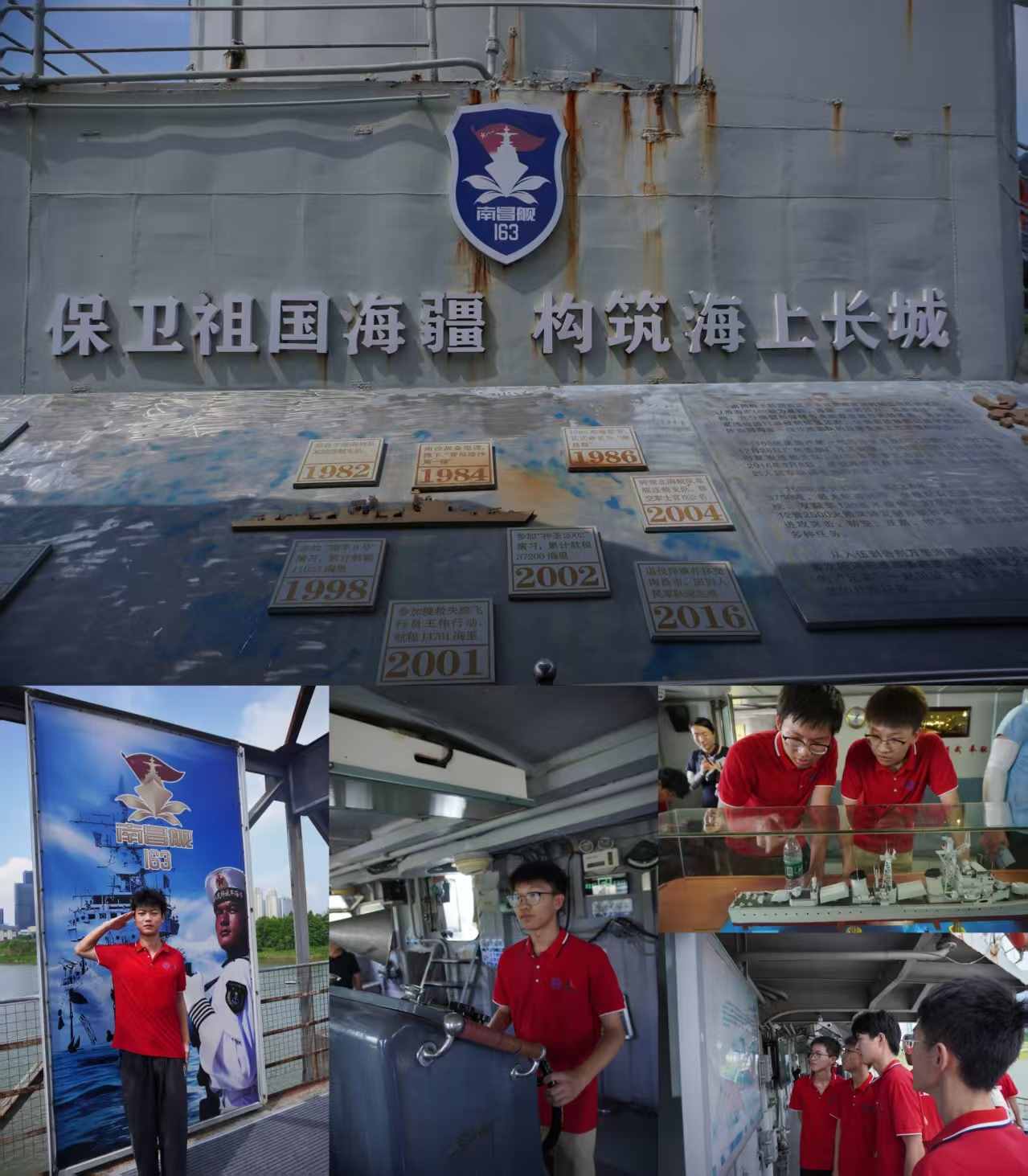 在南昌舰主题公园,实践队参观了163“南昌舰”。这艘英雄战舰自1982年服役至2016年退役,在长达34年的峥嵘岁月里,历经11任舰长、16任政委,圆满执行了80余项重大战备训练与护航任务,为捍卫祖国万里海疆建立了不朽功勋。实践队师生深入探访了舰上的作战室、武器库、炮台等核心区域。在陈列馆内,海军官兵使用过的生活用品、闪耀的荣誉徽章、深水炮弹等珍贵实物展品,无声地诉说着人民海军的发展历程和官兵们真实的海上生活。