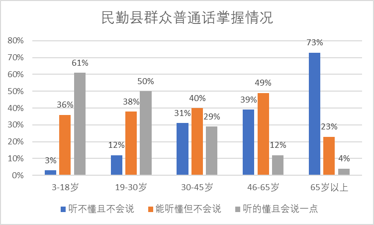 调查显示,民勤县3-18岁群众听不懂且不会说的占比3%,能听懂但不会说的占比36%,听的懂且会说一点的占比61%;19-30岁群众听不懂且不会说的占比12%,能听懂但不会说的占比38%,听的懂但不会说的占比50%;30-45岁群众听不懂且不会说的占比31%,能听懂但不会说的占比40%,听的懂且会说一点的占比29%;46-65岁群众听不懂且不会说的占比39%,能听懂但不会说的占比49%,听的懂且会说一点的占比12%;65岁以上群众听不懂且不会说的占比73%,能听懂但不会说的占比23%,听的懂且会说一点的占比4%。据此数据得知,大部分群众普通话水平较低,其中中老年群体对普通话能力的掌握水平最低,青少年年总体情况较好。总体来说听得懂的群众占比较大,会说普通话的占比较小。据此分析认为,这种现象可能是由于青少年对于普通话接触较早,且在学校生活中具有一定的语言环境和氛围,但老年群体缺乏语言环境,也没有使用需求,所以导致中老年群体普通话水平较低。