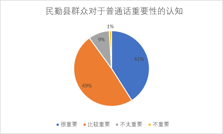 调查显示,民勤县群众认为普通话很重要的占49%,认为比较重要的占41%,认为不太重要的占9%,认为不重要的占1%。据此数据分析,大部分群众对普通话的认识比较积极,但有少部分群众对于普通话的认识还比较消极,这表明虽然我国推普事业取得了一定成果,但推普的工作依然任重道远。