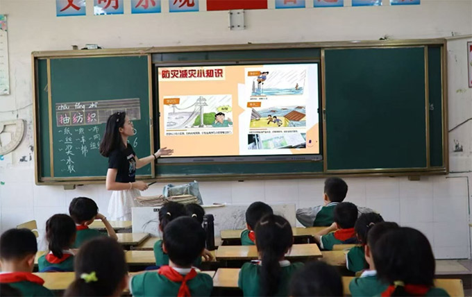 图为团队成员在南昌市田家炳学校开展巨灾预警知识课堂