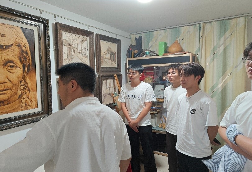 7月10日,实践团首站拜访烙画非遗传承人孙希才。这位退伍军人出身的艺术家,现场演示选材、线描、烙制全流程。面对现代多元娱乐冲击下的传承困境,孙希才提出 “烙画课堂进校园 + 融合现代审美” 创新计划,期望推动传统技艺走向更广阔舞台。实践团成员亲身体验烙画制作,深刻体会到非遗传承中 “守艺” 与 “创新” 需并驾齐驱,传统技艺既要守住 “根”,也要接上时代的 “气” 。