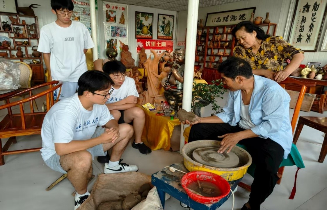 在山东省科普教育基地、优秀非遗传习所——伏里土陶甘信祥工坊,实践团开启非遗传承探寻之旅。甘信祥展示黄黏土晒、揉、塑、烧古法工序,谈及传承,他以融入几何新纹的作品为例,指出“老手艺接上时代气,需留古朴、添创新” 。实践团体验制陶,深知伏里土陶传承,要守古法技艺之根,注入创新巧思,方能让千年手艺永续流传 。