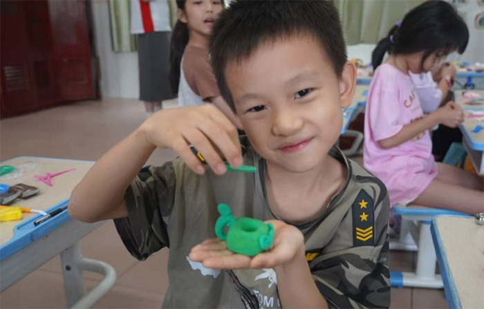 当天下午,实践团成员们带着纸黏土走进高埗镇东圃小学课堂,与孩子们一起动手制作陶瓷作品。孩子们脸上洋溢着兴奋的笑容,认真地模仿着水波纹的样式,或在“罐底”摁下自己的指纹,展现出对陶瓷艺术的浓厚兴趣。